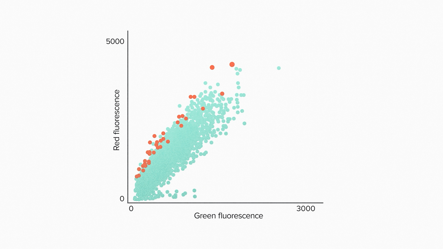Let's take a look at the results. Here we're showing test results for 200,000 strains. The horizontal axis corresponds to the total number of cells within a droplet. The vertical axis corresponds to the secreted protein. A top performer is going to have a lot of protein relative to the number of cells, so we sorted out those points along the top of the curve.