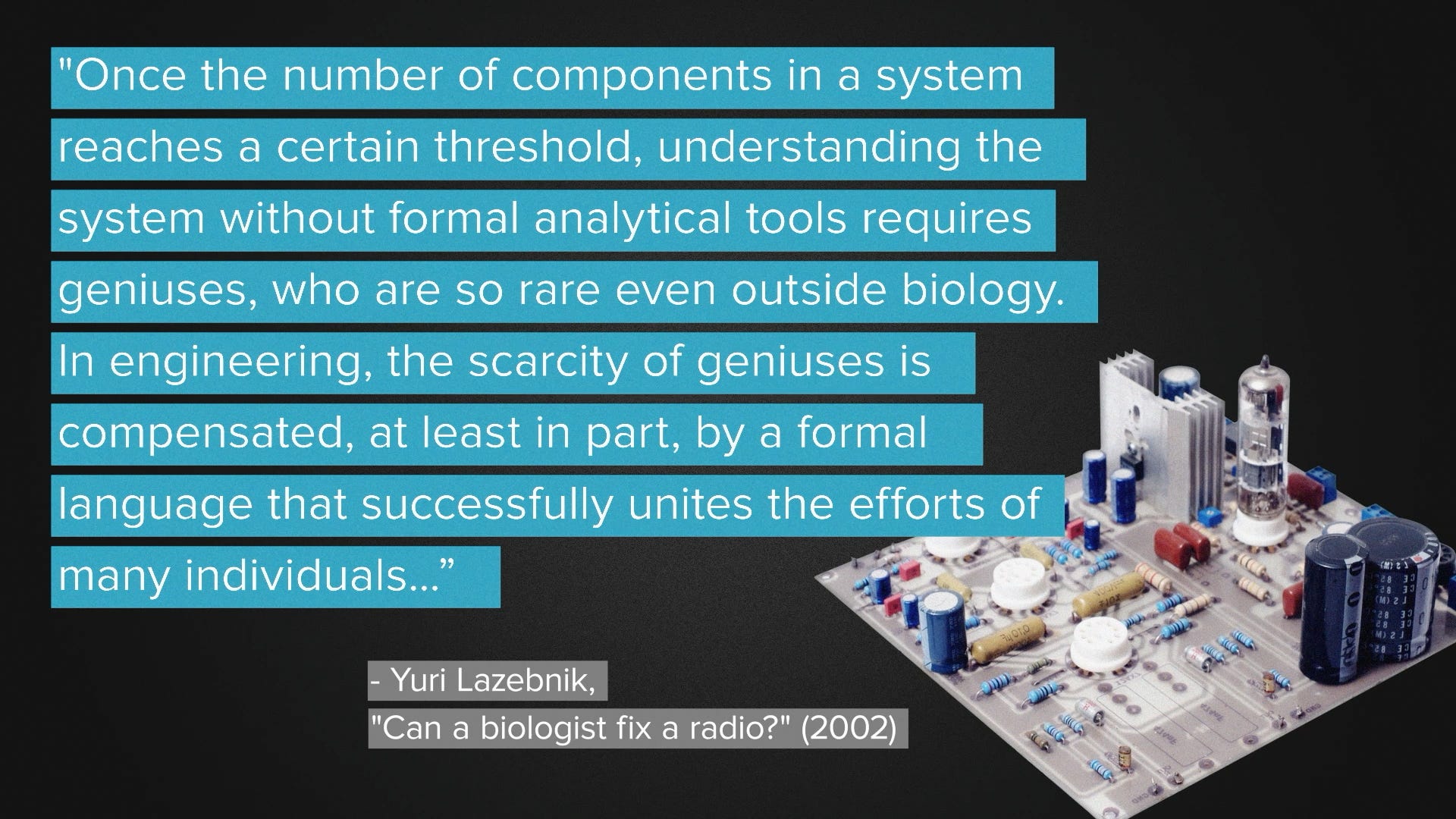 Let me take you back to 2002 and a classic essay written by Yuri Lazebnik. "Can a biologist fix a radio?"2 It doesn't mention synthetic biology, which barely existed at the time, but it describes what would become the synbio understanding of understanding.