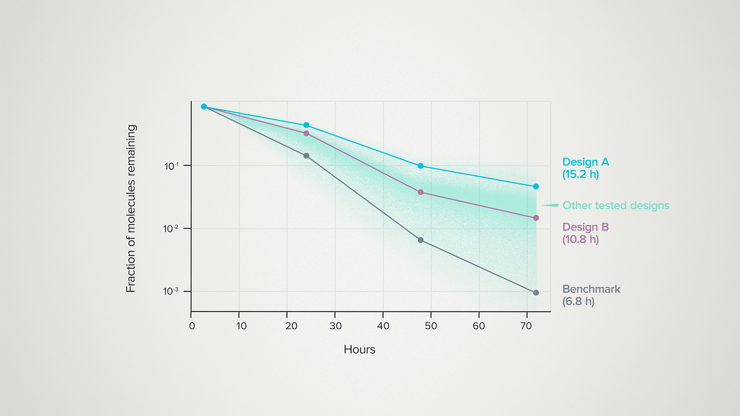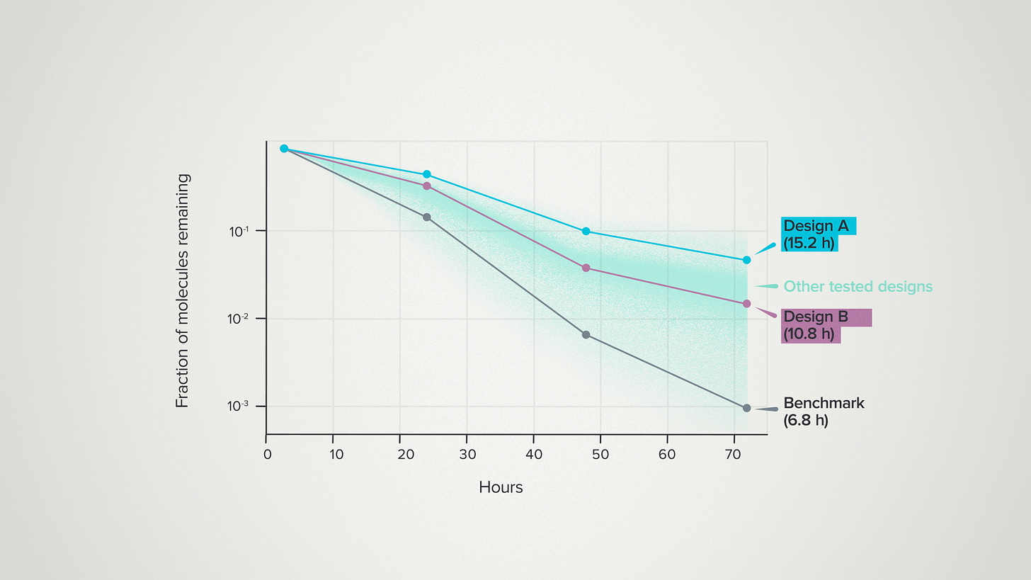 That data became the input for an AI model, which generated the sequences you see here. Down here is a benchmark sequence that is used commonly for RNA constructs. It degrades quickly, with a half life of only six hours. We see a lot of constructs with much better stability. The best designs have more than double the stable half-life.