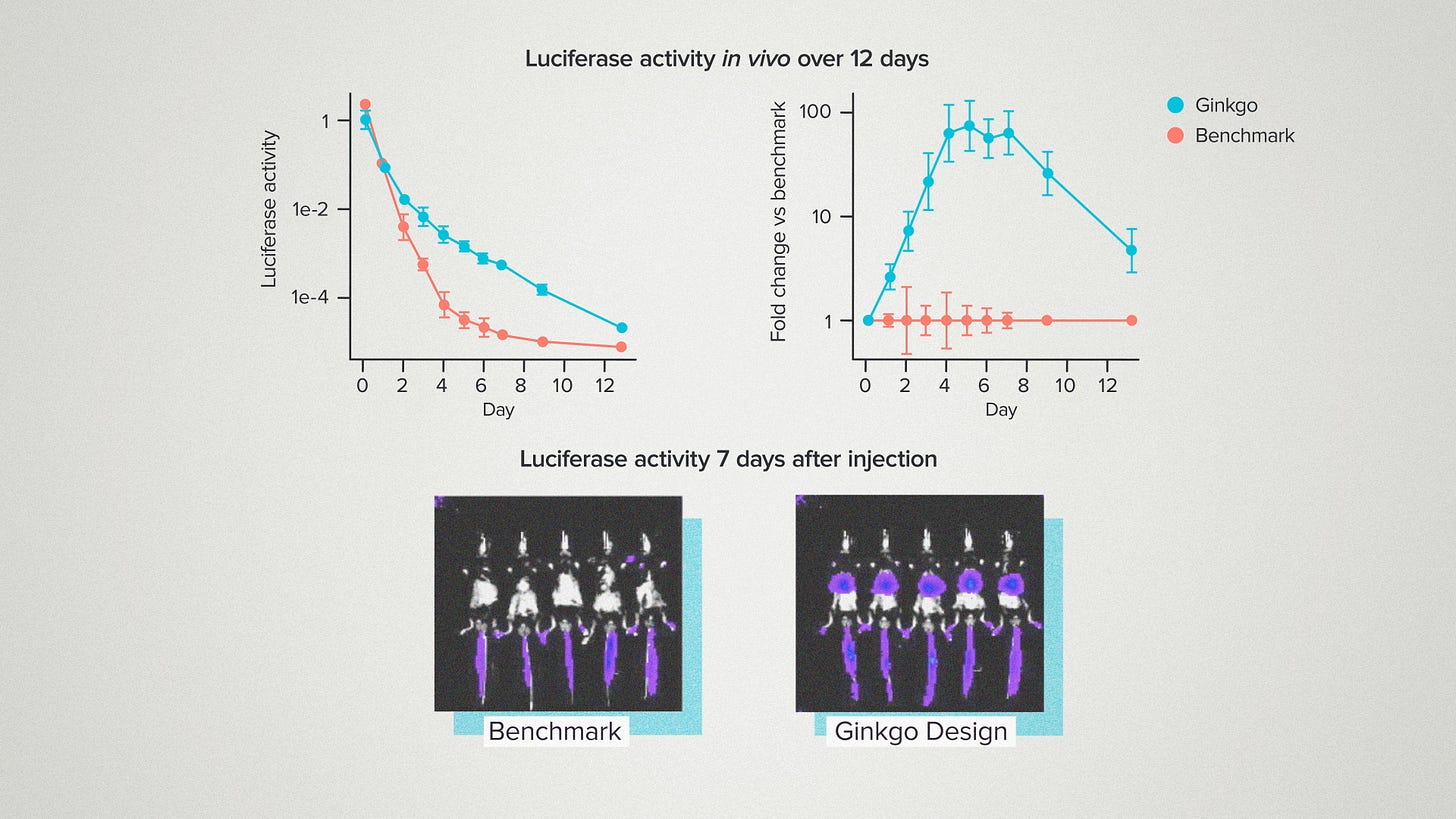 Here's the mouse data. The optimized RNA remained functional longer, with 30-100x more activity depending on the time point, including significantly more function at 7 days. One week after injection, we still see luciferase activity in the Ginkgo Design mice, while the Benchmark mice are blank.