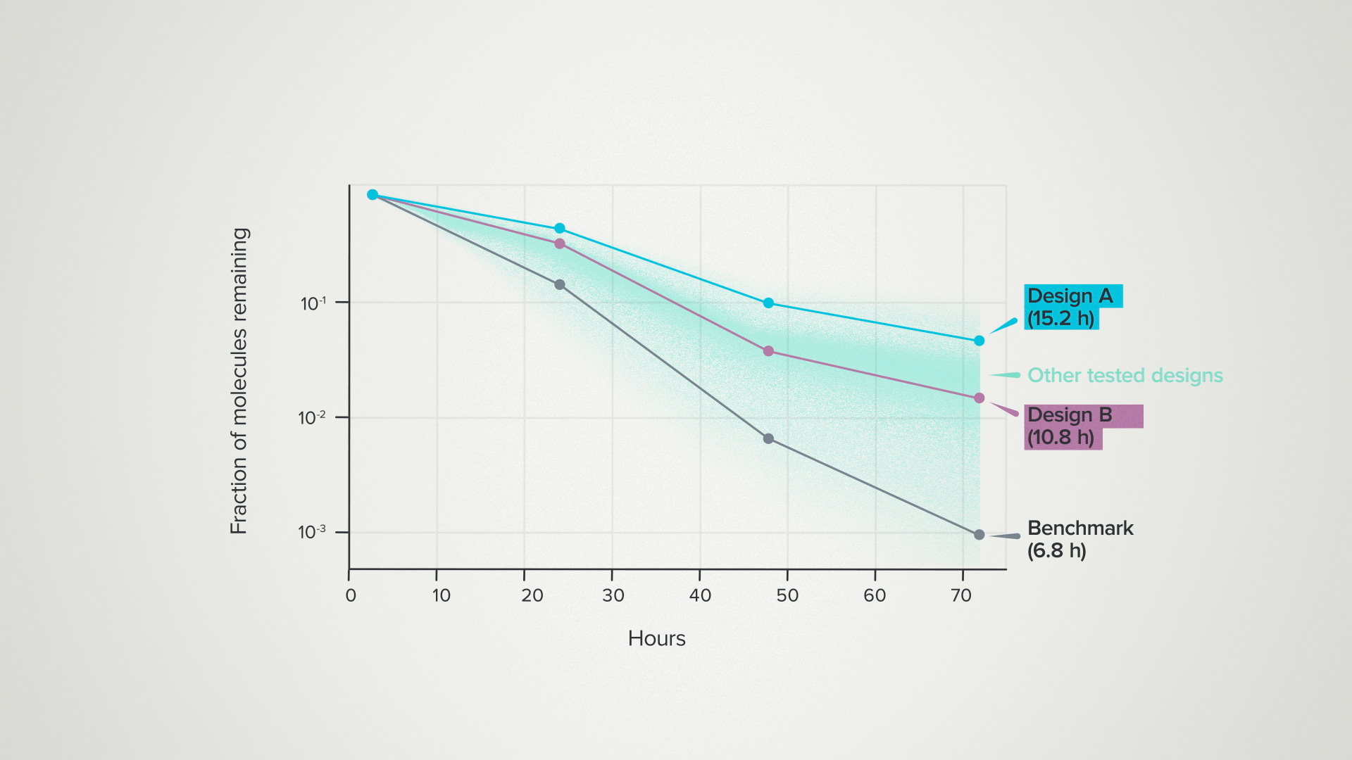 Somewhere on a plot like this is the performance threshold for efficacy in your application. RNA molecules that degrade faster will deliver less of your therapeutic payload. That means you might need a higher dose, with the potential for more untargeted, systemic effects and toxicity.
