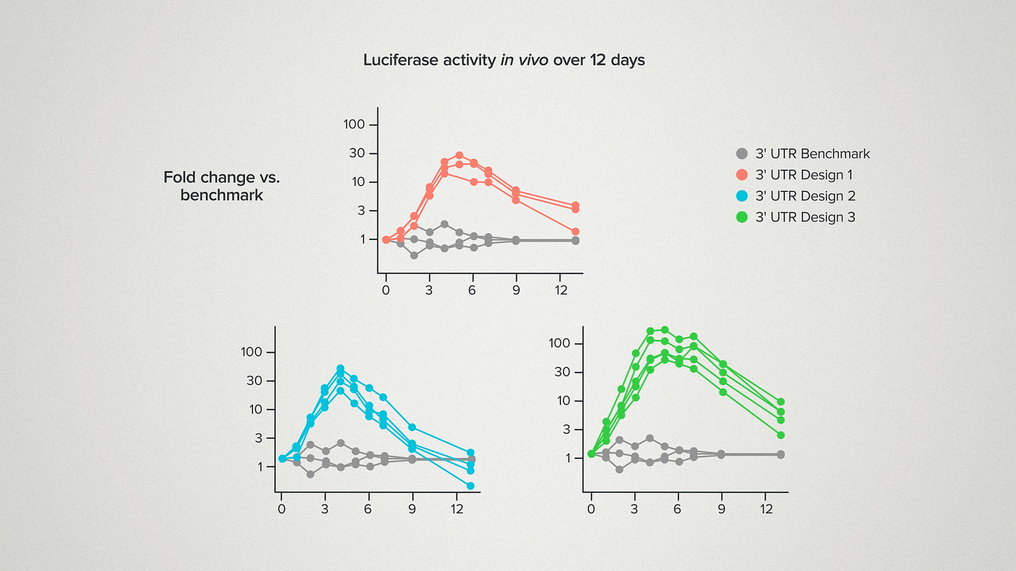 And this was true for 3 different sequence designs. The large data sets that we generated in cell lines were capturing at least some of the sequence features that are relevant for stability in a live mouse. It's not just about screening a library for a single good clone, it's about building a resource that is able to generate sequence designs consistently, adapted to the context of your therapeutic payload.