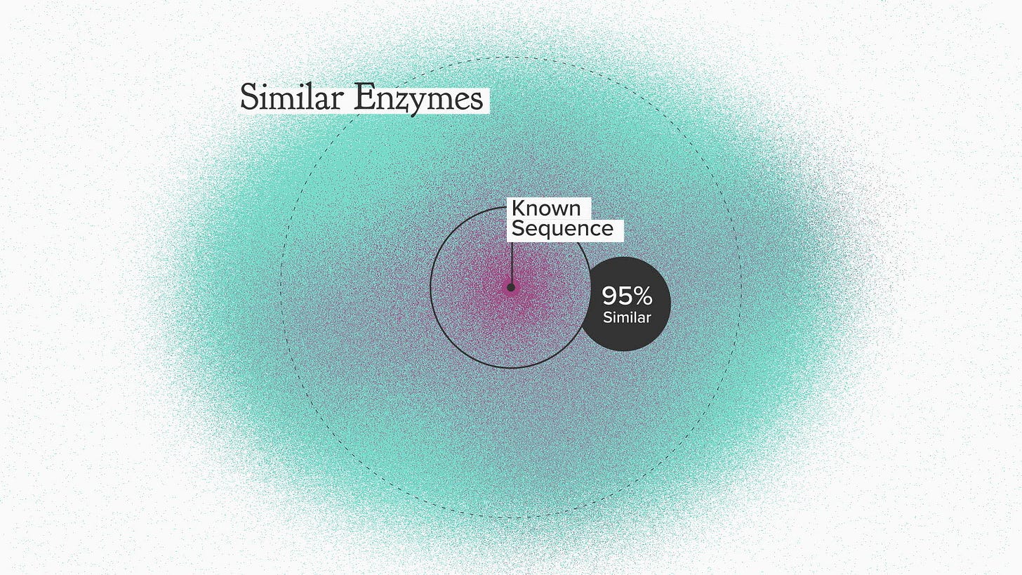 Sequence-based thinking is also built into many of the tools that we use to read and write biology. Before we could synthesize DNA, changes had to be introduced one edit at a time. So new functional sequences were never that different from their parent. You might end up with something that was a little better: faster kinetics, better specificity, but not radically new.